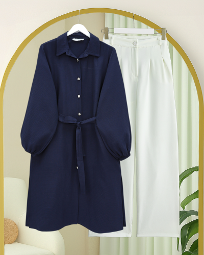 Long Muslin Tunic with Elasticated Cuffs and Drawstring Waist - Navy Blue