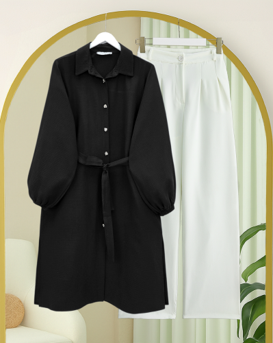 Long Muslin Tunic with Elasticated Cuffs and Drawstring Waist - Black