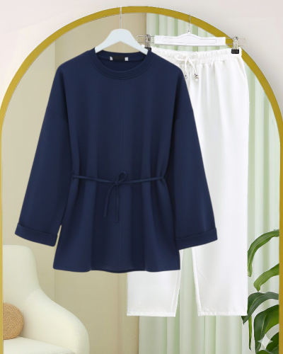 Folded Sleeve, Tied Waist, Slit Combed Cotton Tunic - Navy Blue