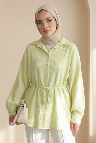• Belted Shirt with Stitching and Sequin Details - Light Yellow