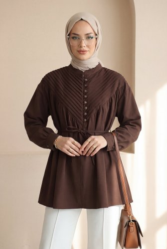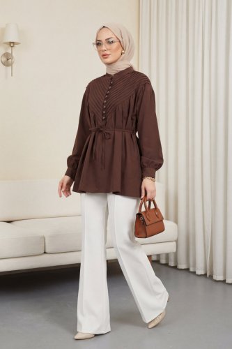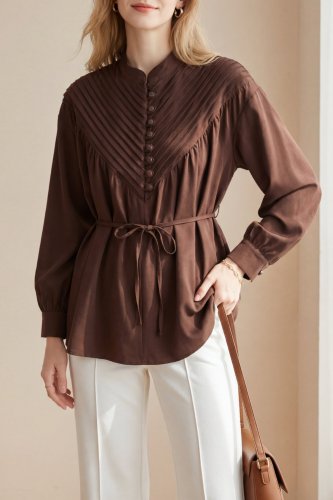 • Half-Button Ribbed Lace-Up Shirt - Brown