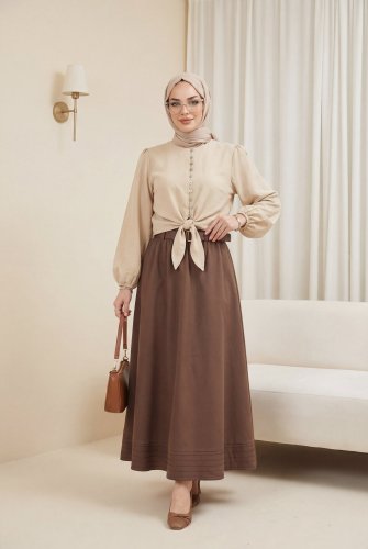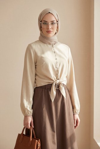 Modal Shirt with Tie-Up Hem, Elastic Waist and Cuffs, and Button Closure - Beige