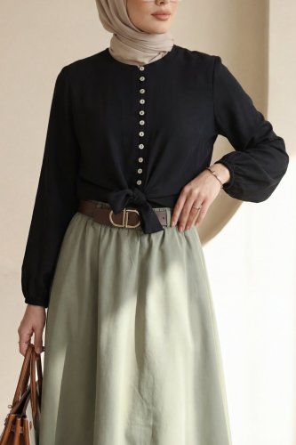 Modal Shirt with Tie-Up Hem, Elastic Waist and Cuffs, and Button Closure - Black