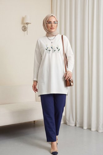 • Daisy Embroidered Round Neck Cotton Tunic - White