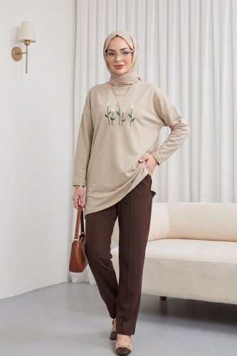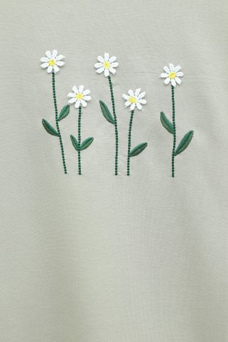• Daisy Embroidered Round Neck Cotton Tunic - Stone