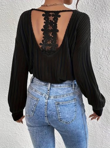 Women's long sleeve v-neck window back lace detail thick ribbed camisole blouse