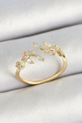 • Brass Leaf Figured Zircon Stone Gold Color Adjustable Women's Ring