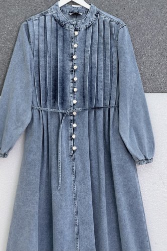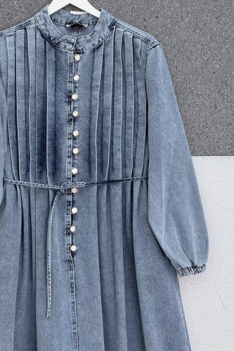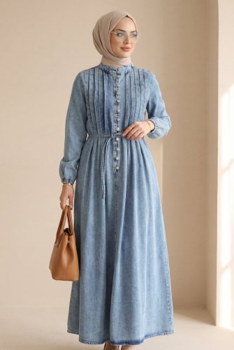 Denim Dress with Elasticated Sleeves, Drawstring Waist, and Half Button Closure - Ice Blue